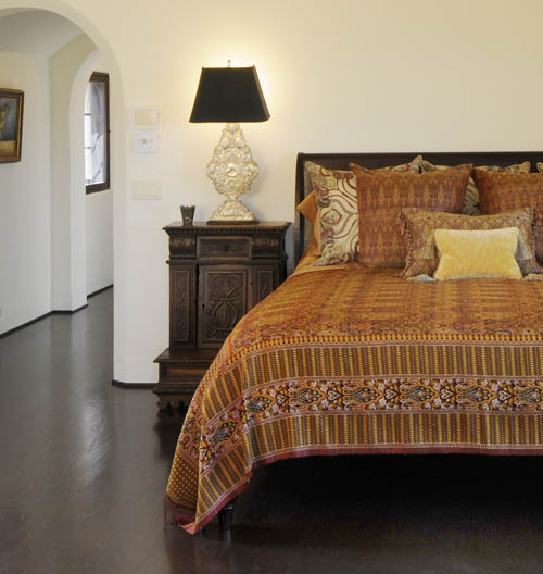 We are pleased to have our Handloomed Akbar fabric, hand woven of silk and wool, featured in the Casa Robles CALM Design Showcase House in Santa Barbara. “Casa Robles”, a remarkable residence on Santa Barbara’s historic Mission Ridge Road, was open for a month of public touring and private fundraising events, raising over $100,000 to support programs of CALM (child abuse listening and mediation). Thank you to Christy Martin from Studio Encanto for choosing our Akbar coverlet and pillows for the stunning design for the master suite.